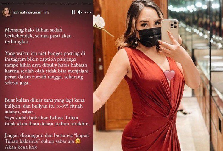 Dalam unggahannya di Instagram Story tersebut, sebenarnya Salmafina tidak menyebut nama siapapun. Meski demikian, dia menyebut soal kehendak Tuhan, dan seseorang yang dulu sempat membuat putri Sunan Kalijaga itu dibully habis-habisan.