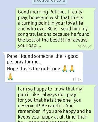 Salah satu kabar yang kembali bikin netizen geger adalah percakapan Syahrini melalui pesan Whatsapp dengan Laurens. Percakapan tersebut menjelaskan kalau Syahrini udah menemukan seseorang yang spesial. Lalu meminta doa pada ayah angkatnya tersebut.