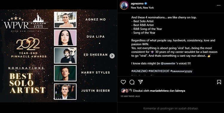 Kabar ini disampaikan langsung oleh Agnez Mo melalui postingan di Instagramnya. Musisi 36 tahun itu memposting sederet gambar di mana dirinya masuk dalam nominasi di ajang tersebut. Tidak main-main, Agnez bersaing dengan musisi Internasional seperti Beyonce, Dua Lipa, Justin Bieber hingga Ed Sheeran.