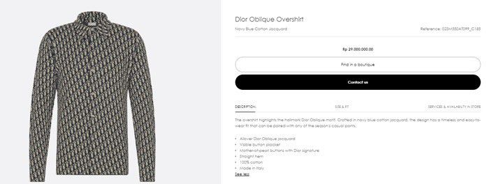 Disebutkan pula keistimewaan baju yang menonjolkan motif khas Dior Oblique tersebut. Di mana, kemeja itu dibuat dengan bahan jacquard katun biru tua. Desainnya dikatakan memiliki ukuran yang abadi dan mudah dipakai.