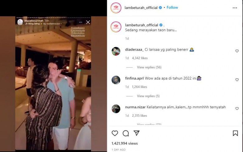 Unggahan Ciuman Zikri Daulay dan Ayu Aulia di akun Instagram Lambe Turah (Screenshot Instagram)