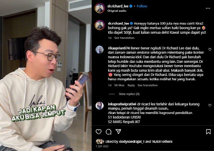 Dokter Richard pun mengaku sudah memaafkan. Tapi dia berseloroh ingin uangnya cair. "Aku sih kalau minta maaf aku maafin, enggak ada masalah karena enggak ada salah dengan aku juga. Yang penting Rp 500 Jutanya tetep cair," tegas Richard.