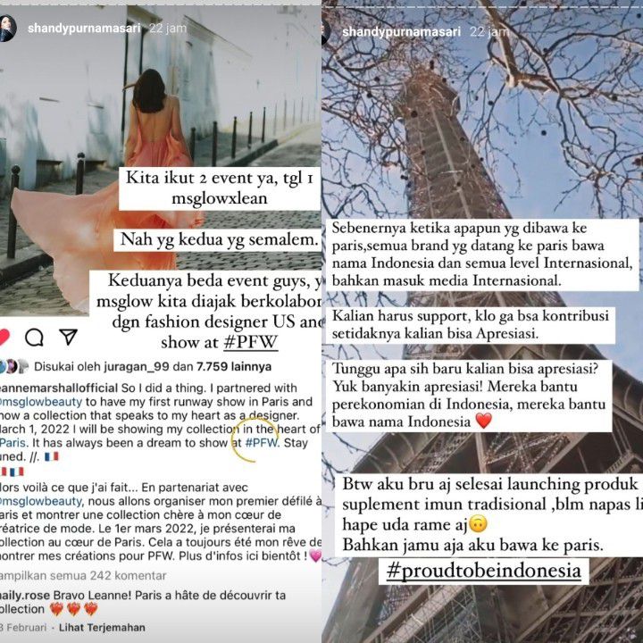 “Sebenarnya ketika apapun yang dibawa ke Paris, semua brand yang datang ke Paris bawa nama Indonesia dan semua level internasional, bahkan masuk media internasional, kalian harus support, kalau nggak bisa kontribusi setidaknya kalian bisa apresiasi. Tunggu apa sih baru kalian bisa apresiasi? Yuk banyakin apresiasi! Mereka bantu perekonomian di Indonesia, mereka bantu nama Indonesia,” tandas Shandy Purnamasari.