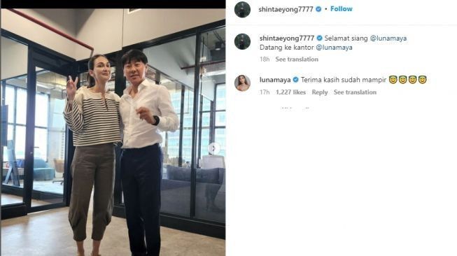 Shin Tae Yong posting fotonya bareng Luna Maya di Instagram (suara.com)