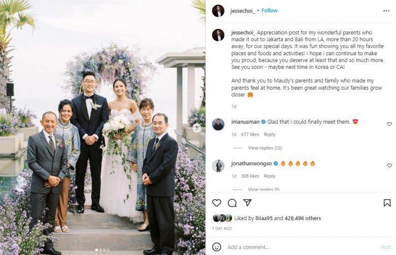 “Postingan penghargaan untuk orang tua saya yang luar biasa yang berhasil pergi ke Jakarta dan Bali dari LA, lebih dari 20 jam perjalanan, untuk hari-hari istimewa kami,” tulis Jesse Choi dengan bahasa Inggris di bagian caption fotonya.