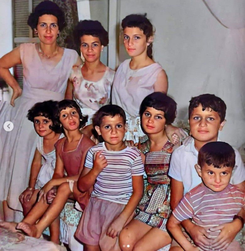 "Bersama-sama, mereka memiliki 8 anak-anak yang menggemaskan. Para bibi dan pamanku, termasuk baba-ku @mohamedhadid, kanan bawah. Bersama pamanku Mahmoud yang memeluknya," tulis Bella menggambarkan foto pada slide kedua.