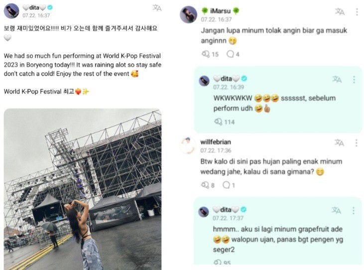 "Btw kalo di sini pas hujan paling enak minum wedang jahe, kalau di sana gimana?" tanya penggemar lainnya. "Hmmm.. aku si lagi minum grapefruit ade. Walopun ujan, panas bgt pengen yg seger2," respons Dita Karang Secret Number.