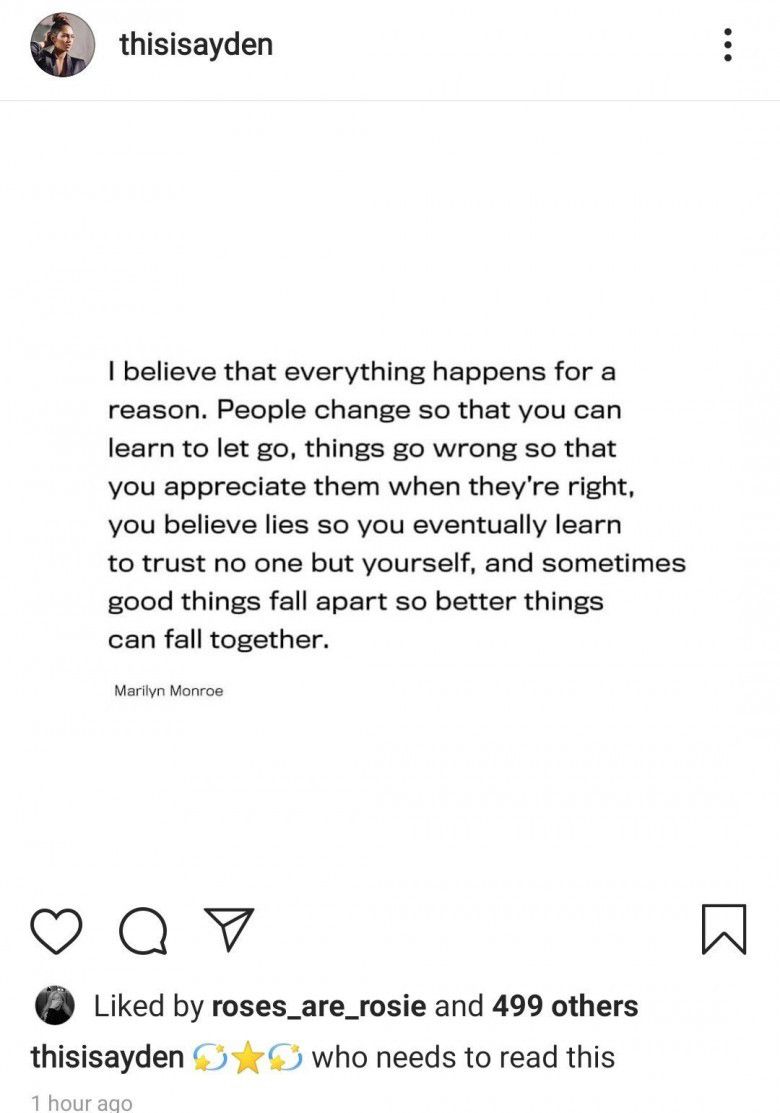 Postingan sedih tersebut milik penyanyi bernama Ayden dengan akun @thisisayden. Ia mengunggah quote dari Marilyn Monroe yang mengatakan bahwa: