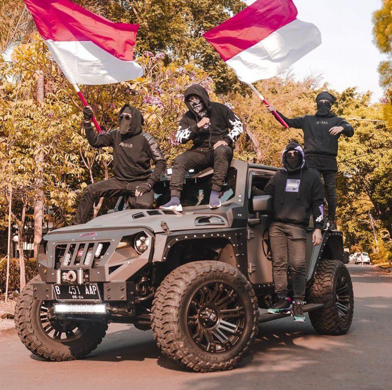 Mobil kedua Jeep Wrangler warna hitam doff yang sudah dimodifikasi. Tampilannya jadi artistik dan keren memang. Harga mobil ini adalah sekitar Rp 1,1 miliar, sebelum dimodifikasi. Yang ini pasti lebih mahal.