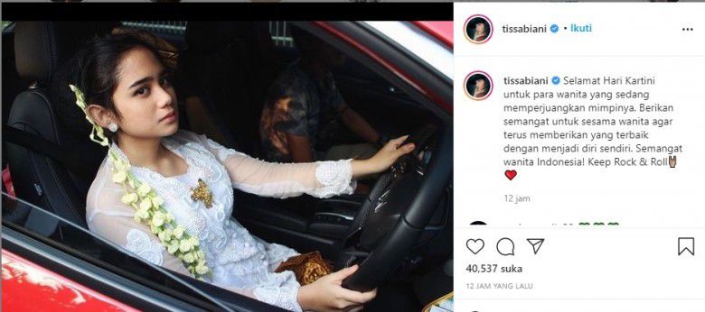 Momen mengenakan kebaya putih tersebut juga bertepatan dengan Hari Kartini yang jatuh pada 21 April lalu. "Selamat Hari Kartini untuk para wanita yang sedang memperjuangkan mimpinya. Berikan semangat untuk sesama wanita agar terus memberikan yang terbaik dengan menjadi diri sendiri. Semangat wanita Indonesia! Keep Rock & Roll," tulis Tissa.