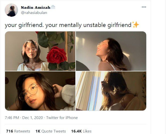 Nadine mengunggah cuitan kolase foto dirinya dengan tulisan "your girlfriend. your mentally unstable girlfriend". Ternyata banyak juga yang merasa kalau Nadine justru meromantisasi penyakit mental.