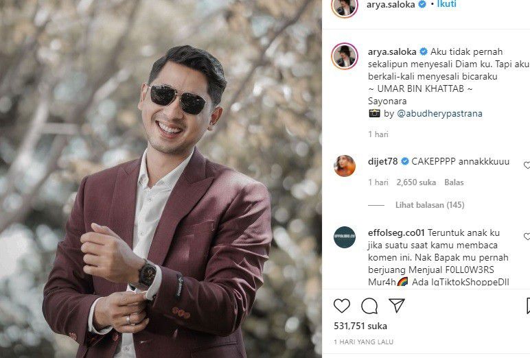 Pemeran Aldebaran ini memposting foto dirinya mengenakan jas dan kacamata hitam. Arya memancarkan aura ketampanan yang luar biasa. "Aku tidak pernah sekalipun menyesali Diam ku. Tapi aku berkali-kali menyesali bicaraku - UMAR BIN KHATTAB. Sayonara," tulis Arya.