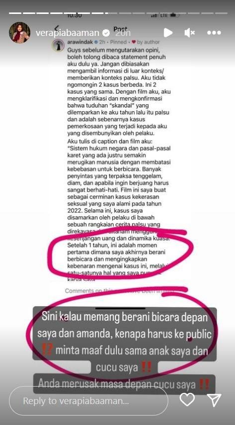 Melalui Instagram Story @verapiabaaman, Vera Noor memperlihatkan pernyataan Arawinda yang merasa dirinya adalah korban kekerasan seksual dari Guiddo Ilyasa.