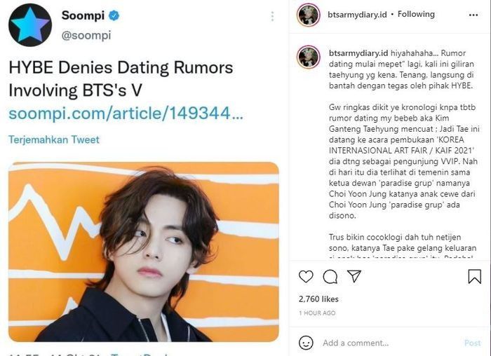 “Aku tidak peduli apakah mereka berkencan atau tidak, jika Taehyung mencintai seseorang, aku akan mengucapkan selamat padanya~~ Aku harap dia bisa melakukan apapun yang dia mau.”