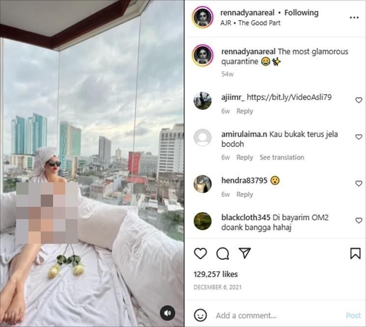 Videonya itu pun banyak ditonton lantaran ia mengenakan jubah mandi yang tidak diikat sehingga buah dadanya nyaris terlihat. Rena tampak bahagia saat menjalani karantina di sebuah hotel dengan pemandangan indah.