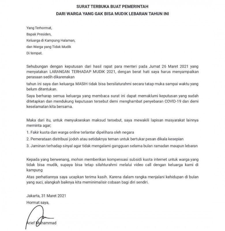 Sekilas surat terbuka tersebut tampak serius. Arief kemudian mengeluarkan tuntutan soal efek yang timbul dari imbas pelarangan mudik. Tuntutan yang menyuarakan hak kaum jomblo dan fakir kuota internet.