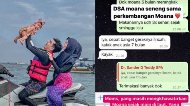 "Moms, yang masih mengkhawatirkan Moana sejak main di laut, yang kemarin menunggu kabar ketika pulang. Alhamdulillah asyaallah tabarakallah berkat doa auncle, Moana justru semakin aktif dan malah merangkak ambil mainan. Alhamdulillah Moana sehat. DSA (dokter spesialis anak) senang sama perkembangan Moana," tandas Ria Ricis.