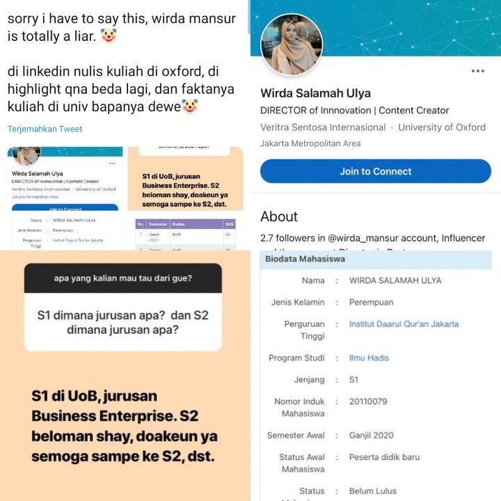 "Maaf saya harus mengatakan ini, wirda mansur benar-benar pembohong. Di LinkedIn nulis kuliah di Oxford, di highlight QnA beda lagi, dan faktanya kuliah di universitas ayahnya sendiri," cuit akun Twitter @strawbeelly dengan membagikan screenshot LinkedIn dan Q&A milik Wirda.