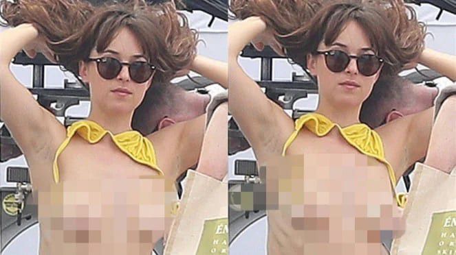 Terakhir, beredar foto Dakota Johson yang tampak percaya diri ketika melepas bikininya berwarna kuning dan santai memamerkan payudaranya saat berada di pantai. Dengan mengenakan kacamata hitam, Dakota memainkan rambut panjangnya dalam keadaan setengah bugil.