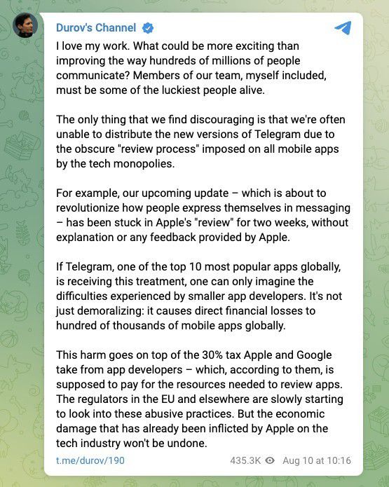 Durov menunjukkan bahwa jika sebuah aplikasi sepopuler Telegram menerima perlakuan ini, orang dapat "membayangkan kesulitan yang dialami oleh pengembang aplikasi yang lebih kecil."
