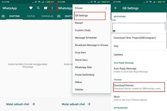 Cara mengganti tema WhatsApp berikutnya adalah dengan memilih tombol titik tiga pada pojok kanan atas GB WhatsApp. Lalu, pilih GB Settings dan pilihlah download Themes. Dan kamu bisa mengganti tema WhatsApp menjadi tema transparan lho.