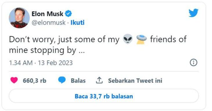 Elon Musk baru-baru ini membahas soal UFO yang ditembak oleh militer Amerika Serikat. Dirinya malah menganggapnya sebagai lelucon hingga mengatakan jika itu adalah ‘teman-temannya’ yang berkunjung alias alien.