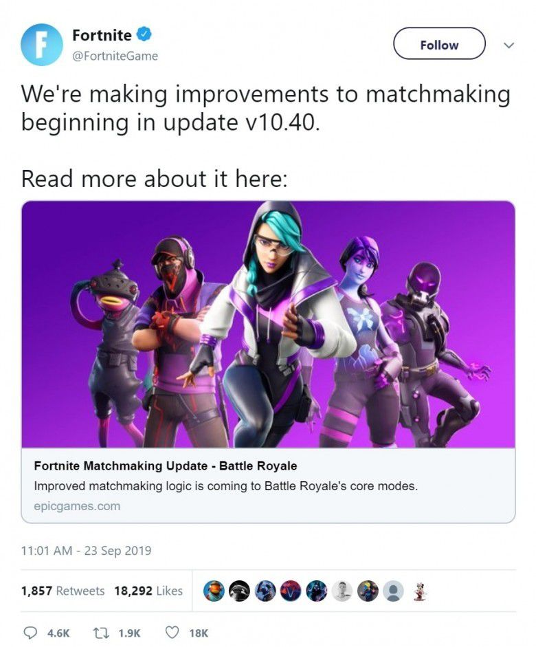 Kedua fitur ini akan diluncurkan dengan pembaruan Fortnite 10.40 akhir pekan ini. Studio berencana untuk meluncurkan tweak sistem matchmaking secara perlahan sehingga dapat memantau kinerjanya.