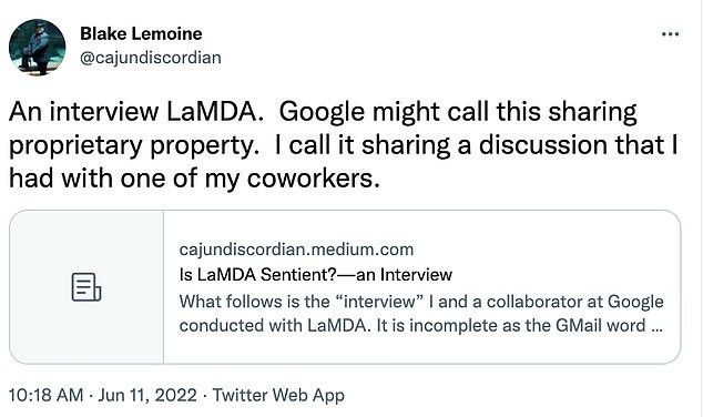 Twit Blake Lemoine tentang wawancaranya soal LaMDA (news.allauction.live)