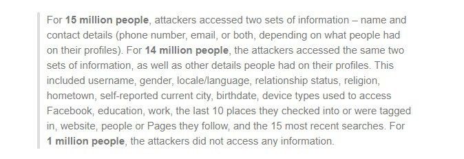 "15 juta akun diretas oleh hacker dan mengambil dua jenis informasi- nama dan list kontak (nomor telepon, email atau keduanya, tergantung pada apa yang orang-orang cantumkan pada profil FB). 14 juta akun lain, hacker berhasil mengambil 2 jenis data yang sama dan juga detail informasi lain yang dicantumkan pengguna di halaman profil. Informasi lain tersebut mencakup nama akun, jenis kelamin, bahasa asal, hubungan personal, agama, asal, tanggal ulang tahun, jenis gadget yang digunakan untuk masuk Facebook, pendidikan dan 10 tempat terakhir yang dikunjung,"