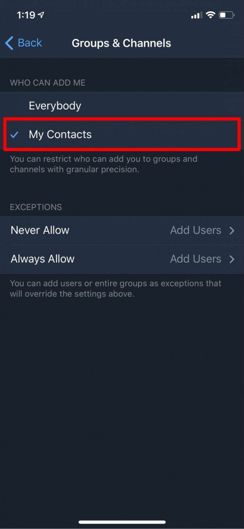 3. Pilih Grup & Saluran (Groups & Channels) dan centang Kontak Saya (My Contacts), alih-alih Semua Orang (Everybody). Kamu juga dapat mengecualikan kontak tertentu (atau menyertakan pengguna tertentu yang tidak ada dalam kontakmu).