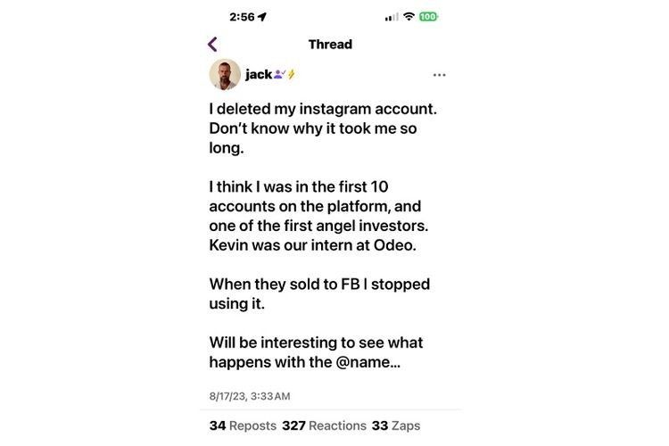 "Menghapus akun Instagram saya setelah 12 tahun. Termasuk salah satu dari 10 akun pertama, dan salah satu angel investor pertama," kata Dorsey dalam postingannya di Twitter/X, seperti dikutip dari Insider, Rabu (23/8/2023).