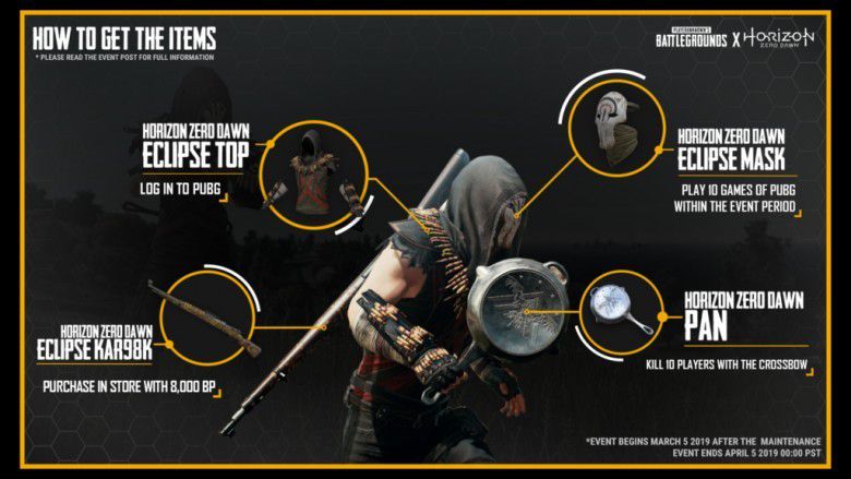 Item kedua adalah topeng Eclipse yang bisa kalian dapatkan kalau kalian menyelesaikan sepuluh pertandingan. Item ketiga semakin sulit, untuk mendapatkan versi HZD dari wajan ikonik PUBG, kalian harus membunuh sepuluh pemain lain dengan crossbow.