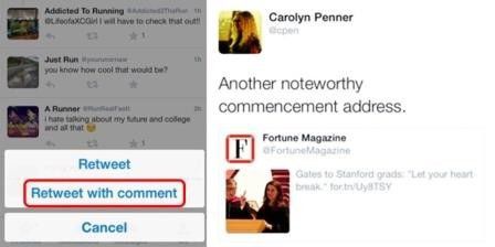 Retweet yang dimaksudkan adalah retweet beserta komentar. Dan akan benar-benar terpisah dari penghitung retweet saat ini, tetapi ia akan muncul di baris yang sama di bawah postingan.