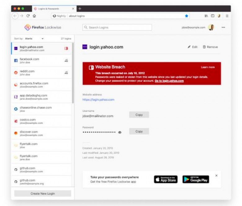 Untuk memulainya, pengelola kata sandi dari peramban yakni Lockwise yang sekarang akan menampilkan peringatan kritis dalam kotak merah jika ada situs web yang menyimpan password kalian mengalami peretasan.