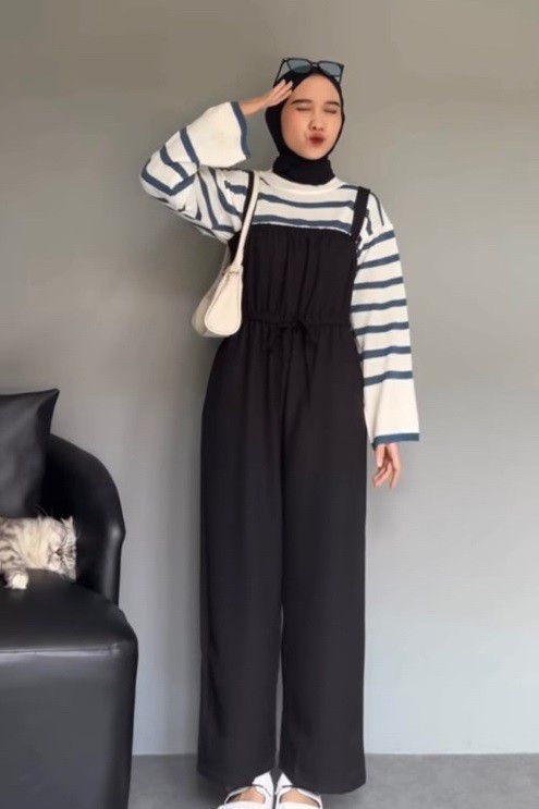 Ide outfit monokrom yang pertama adalah jumpsuit polos dengan inner motif. Ide outfit yang satu ini khas anak muda banget. Pilih jumpsuit warna hitam polos lengan pendek yang dipadukan dengan inner motif garis-garis hitam memang terlihat simple tapi tetap fashionable, kan? Tapi warna inner nggak harus garis-garis hitam, kamu bisa memakai warna abu-putih juga kok. Tergantung selera kamu.