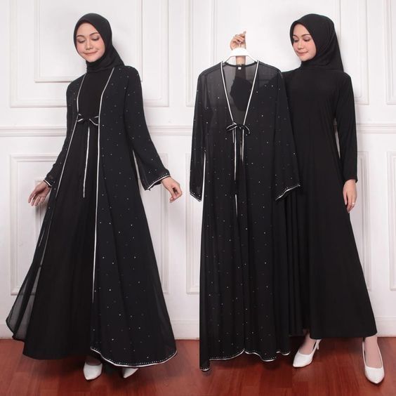 Jika kamu ingin tampil lebih lebih nyaman namun tetap stylish, abaya hitam dengan aksen garis vertikal yang panjang bisa menjadi pilihan yang tepat. Kamu dapat menambahkan aksesori belt tebal berwarna putih atau outer berbahan tipis yang manis.