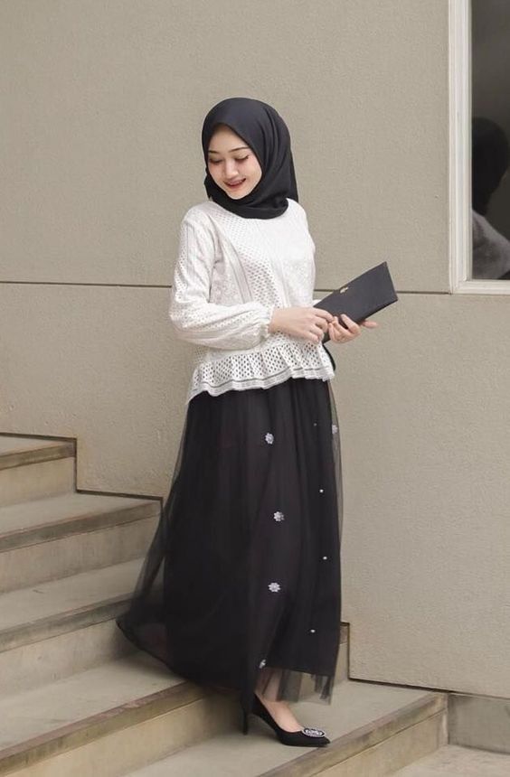 Kombinasi blouse putih dengan rok hitam juga bisa menciptakan penampilan yang anggun dan feminim. Kamu dapat memilih blouse dengan detail yang menarik seperti renda atau brokat dan lengkapi dengan rok hitam berlapis tulle untuk menambahkan sentuhan glamor pada penampilanmu.