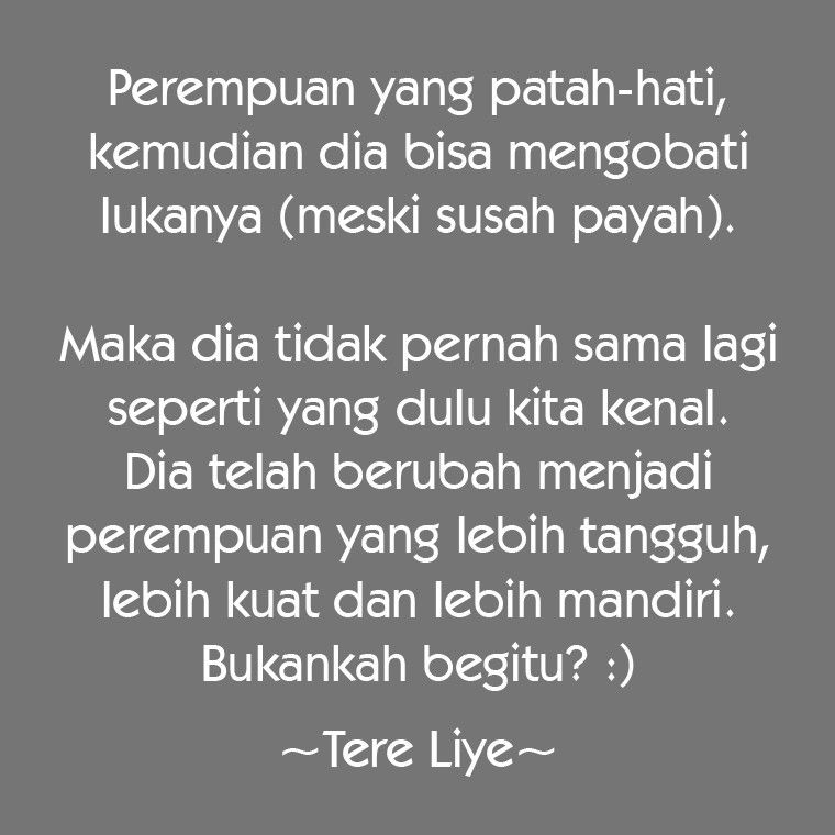 "Perempuan yang patah hati, kemudian dia bisa mengobati lukanya (meski susah payah). Maka di tiak pernah sama lagi seperti yang dulu kita kenal. Dia telah berubah menjadi perempuan yang lebih tangguh. Lebih kuat dan lebih mandiri. Bukankah begitu?"