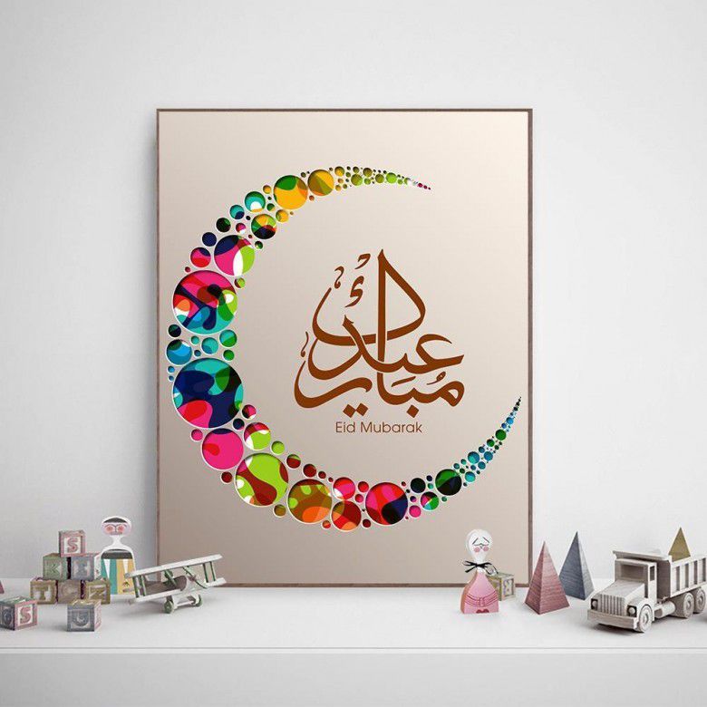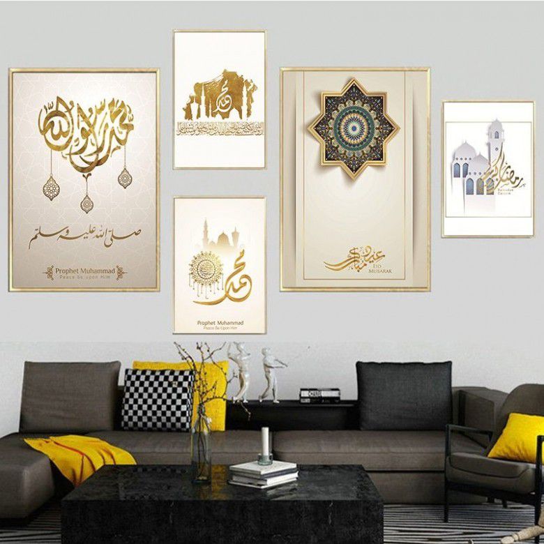 Kamu juga bisa menghias area dinding dengan wall decor bertema Islami. Sudut ini bisa jadi spot buat foto keluarga tahun ini~
