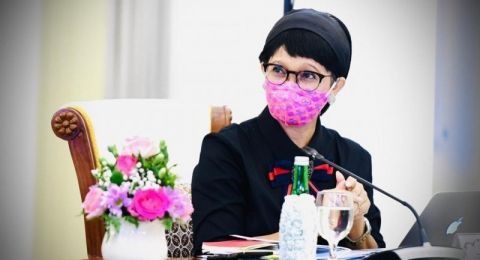 Retno tampil muda dengan memotong rambutnya dengan model pixie berponi dan mengenakan bandana hitam dalam sebuah pertemuan dinas.
