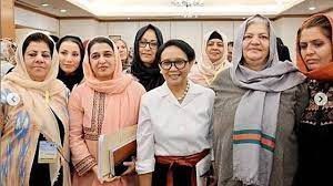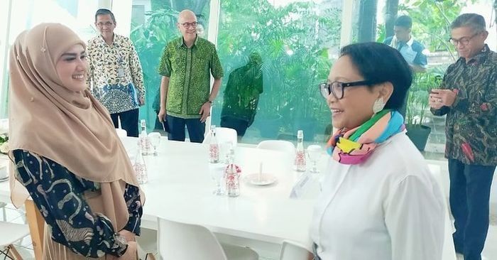 Retno Marsudi yang kali ini menggunakan scarf colorful dan anting yang lebih besar berbentuk api saat bertemu dengan Mulan Jameela.