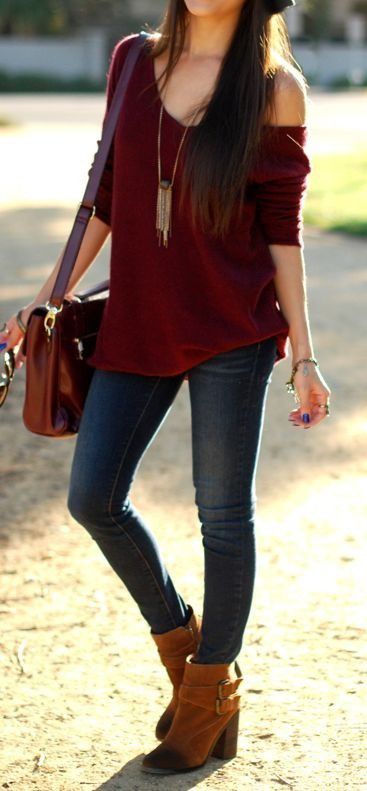 Kaos off-shoulder sabrina bisa ngebuat terlihat seksi. Atasan merah marun yang begini bisa dipakai di acara santai malam hari. Masih bisa tetap ditambah aksesoris untuk mempermanis.
