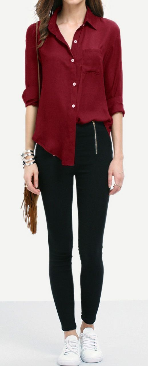 Kemeja merah maroon dapat dimasukkan atau di keluarkan aja. Atau untuk mempertegas kesan casual bisa dimainin separo dimasukin, separonya enggak.