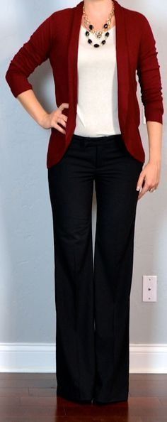 Atasan warna putih dan outer cardigan warna merah marun diatas bisa dipake untuk acara dinner keluarga. Bisa dipakai malam hari dan siang hari. Kalung punya efek yang cukup besar. Cutting celana jeans juga bisa disesuaikan.