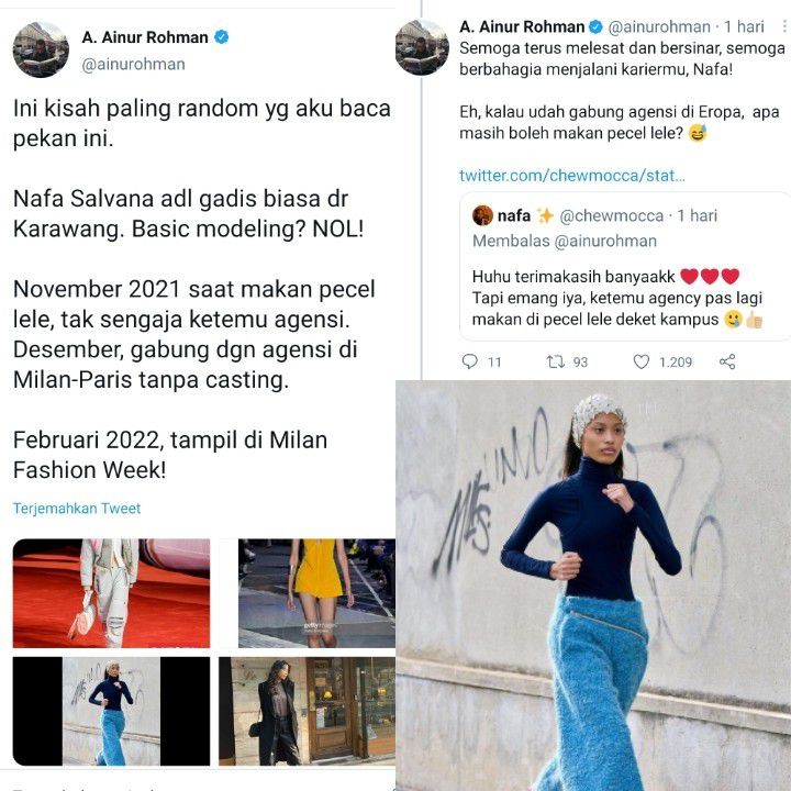 “Ini kisah paling random yg aku baca pekan ini. Nafa Salvana adl gadis biasa dr Karawang. Basic modeling? NOL! November 2021 saat makan pecel lele, tak sengaja ketemu agensi. Desember, gabung dgn agensi di Milan-Paris tanpa casting. Februari 2022, tampil di Milan Fashion Week!,” tulis akun @ainurohman, Minggu, 13 Maret 2022.