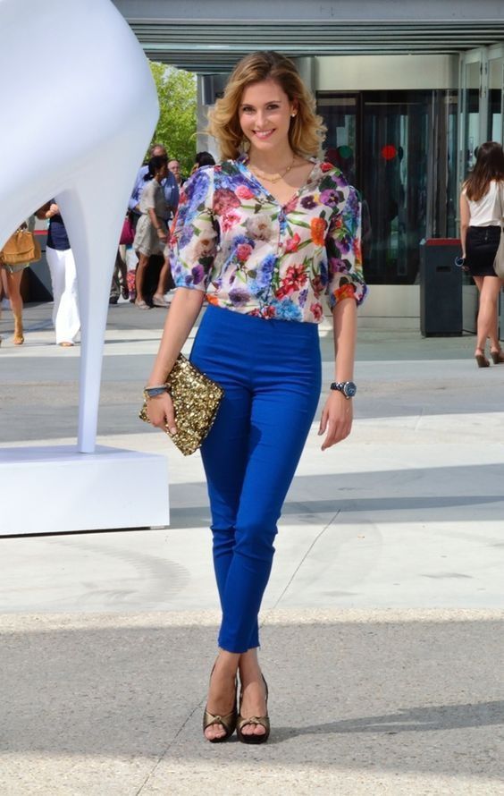 Celana terang berwarna blue cobalt dan kemeja floral (pinterest.com)