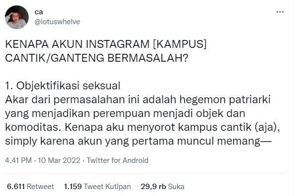 Salah seorang netizen di media sosial Twitter dengan akun bernama @lotuswhelve mengungkapkan keresahannya soal kemunculan akun kampus cantik yang problematik ini.