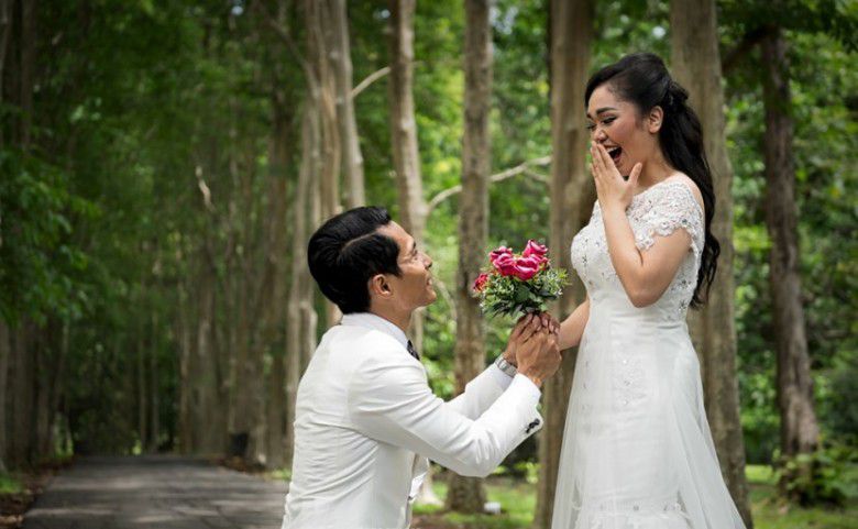 Kalau pengin foto yang romantis, sang calon lelaki bisa melakukan pose seperti ini di manapun tempatnya hehe, mantap kali!