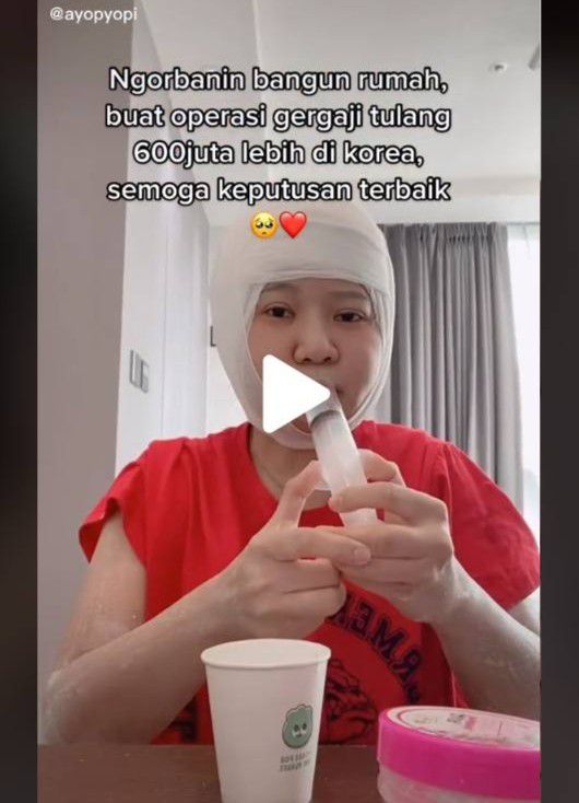 Namun, tak sedikit pula sebagian orang yang mau melakukan hal serupa demi menyempurnakan wajah mereka. Seperti wanita yang terlihat dari akun TikTok @ayopyopi. Wanita tersebut tampak membagikan momen saat dirinya selesai operasi gergaji rahang.
