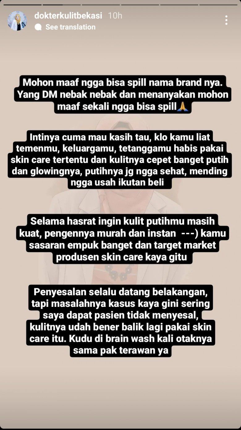 "Selama hasrat ingin kulit putihmu masih kuat, pengennya murah dan instan, kamu sasaran empuk banget dan target market produsen skincare kayak gitu," pungkasnya.